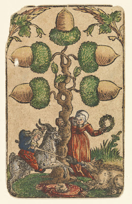 As cartas de jogar parecem ter uma ou muitas histórias embrulhadas umas nas outras. A história das cartas de jogar em Portugal até merece uma rubrica à parte no artigo da Wikipedia em inglês. Enquanto pesquiso e não pesquiso mais sobre isto deixo esta imagem porque as bolotas e as imagens das bolotas também me intrigam.