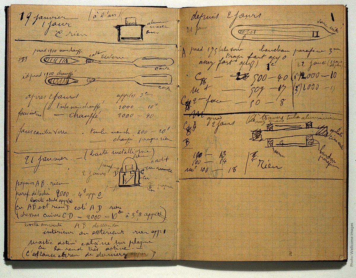| Este caderno de 1899-1902 é radioactivo e continuará a ser por mais 1.500 anos. Fotografia e informação na conta do Prémio Nobel no Twitter. |